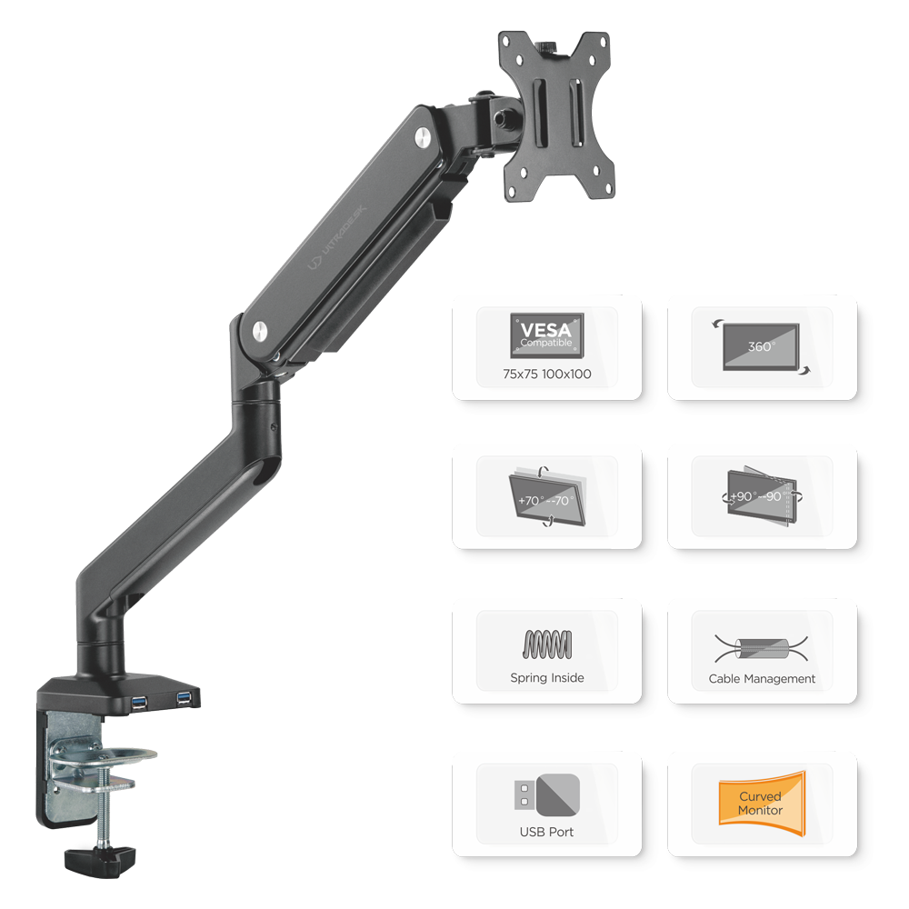 ULTRADESK BRANCH SINGLE is an advanced mount for a single monitor up to 32 inches in size. The universal nature of its design makes it compatible with most flat and curved displays available on the market today. It offers two mounting methods, which makes it compatible with any type of computer desk. The holder provides a number of options, that make it easy to position the monitor in the optimal spot. Gain even more space on your desktop with a professional monitor mount!