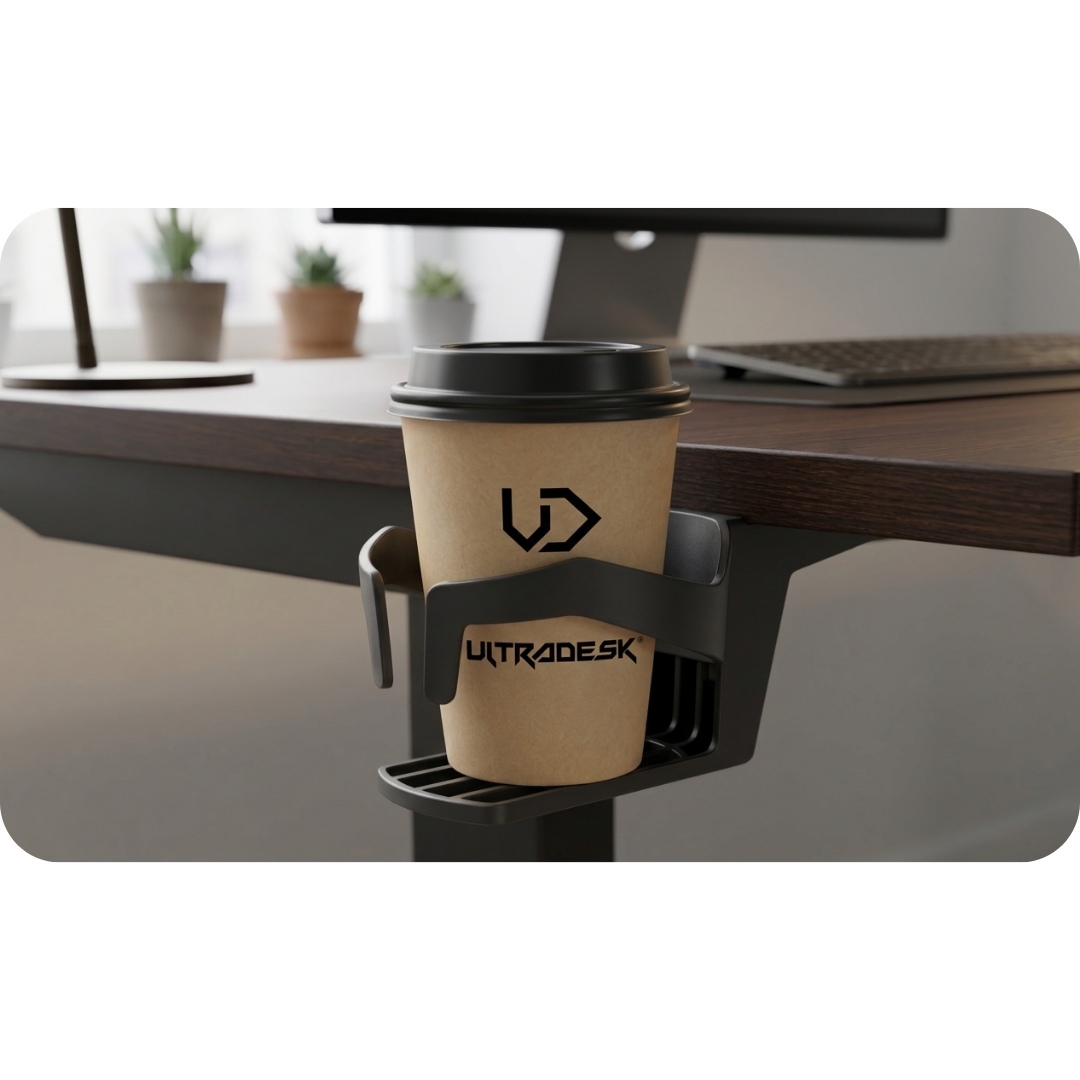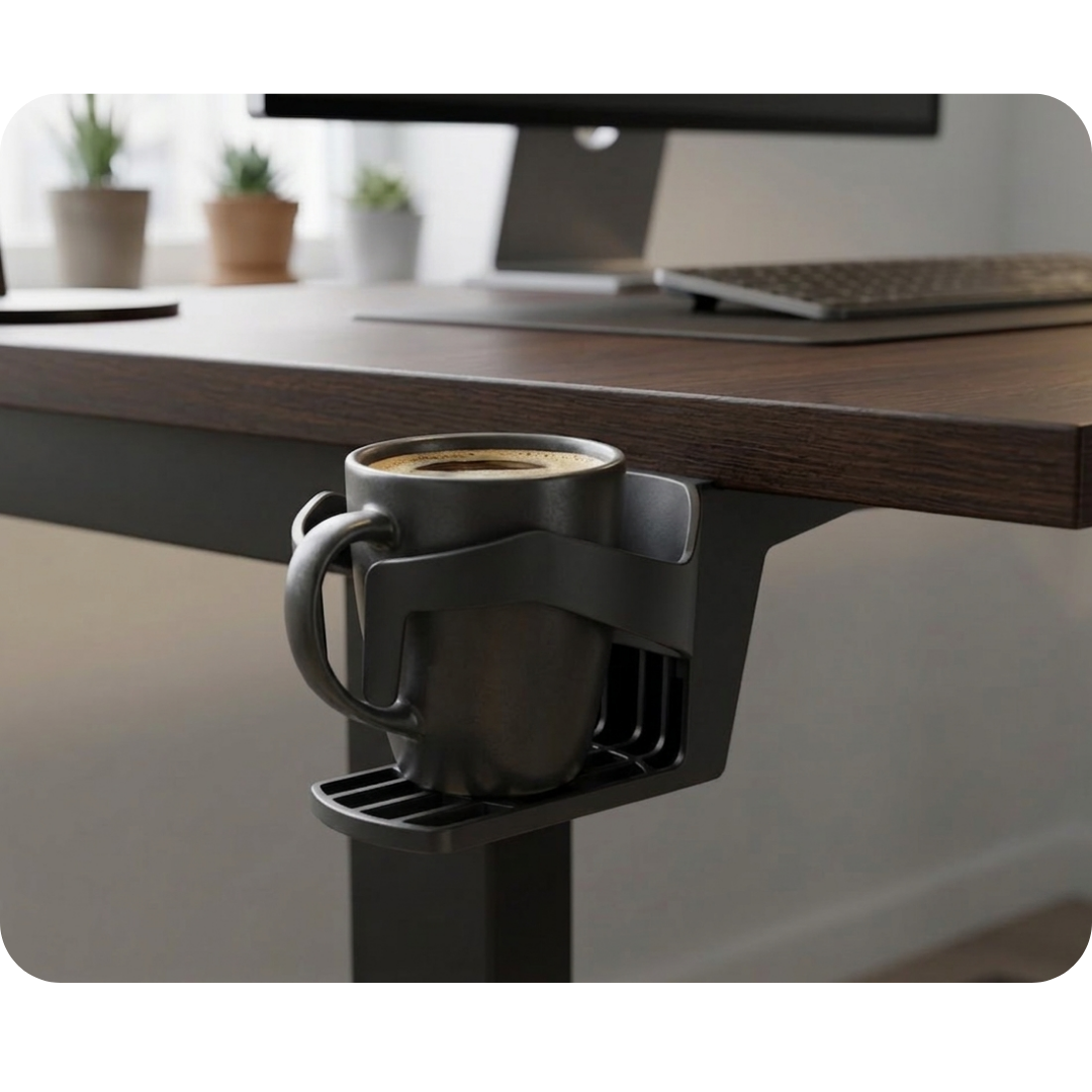 Space saving: Moving your drink off the desk surface frees up space for documents, a mouse, and a keyboard.