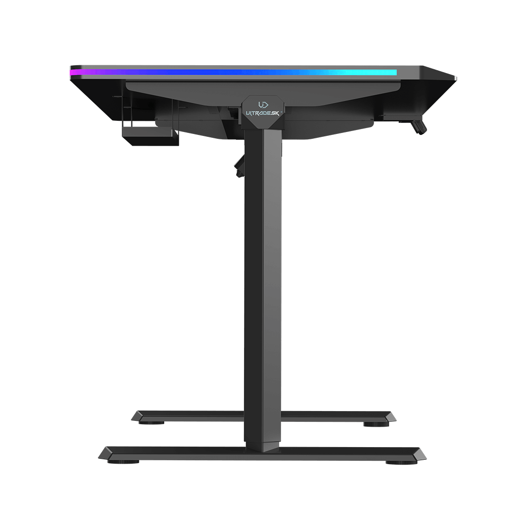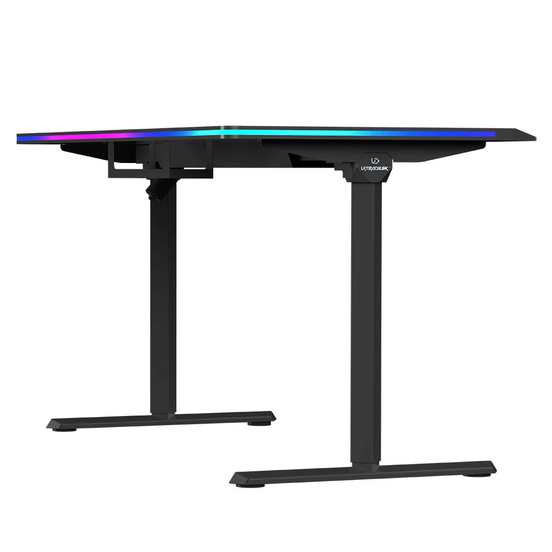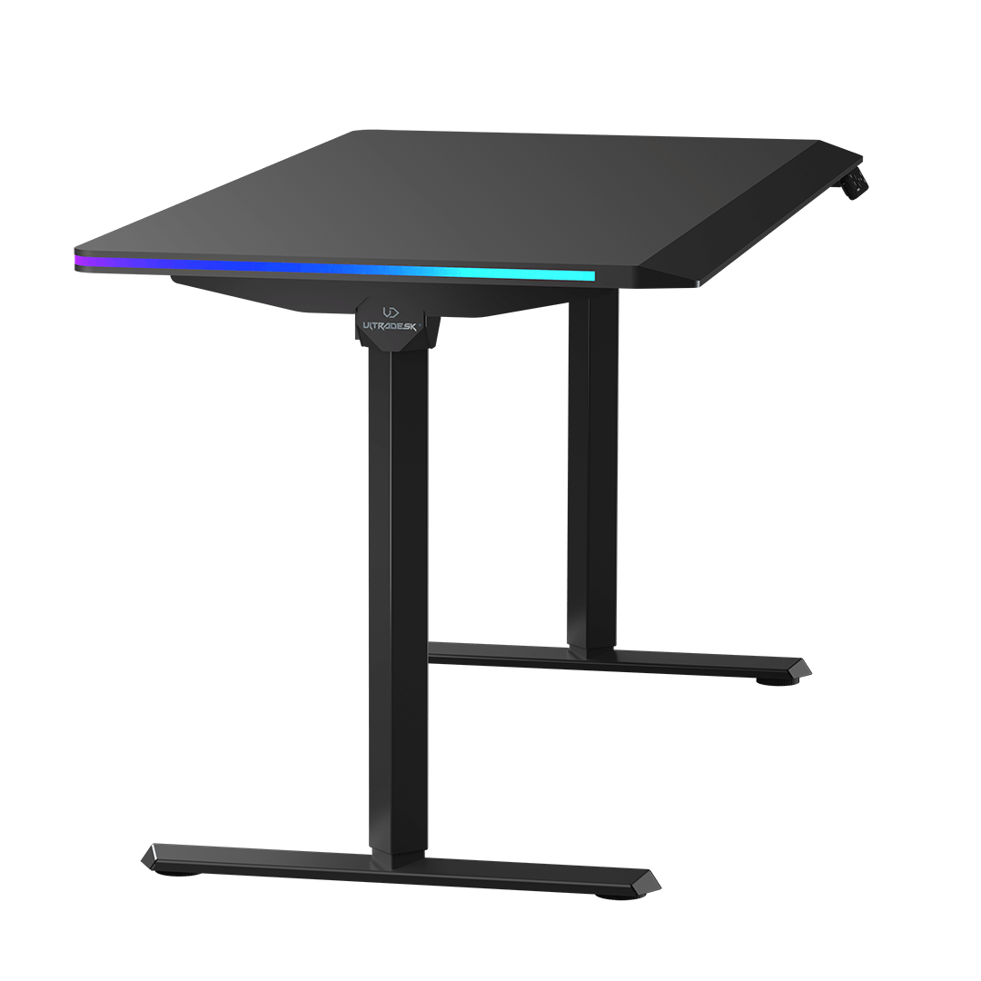 ULTRADESK QUEST is a modern computer desk with electric height adjustment, a thick, one-piece desktop, a reinforced frame, and unique LED RGB PRISMATIC lighting. It also features a user-friendly control panel with internal memory, a shelf for cables and power strips, and numerous features that enhance durability and ergonomics. QUEST guarantees a high level of safety and an appealing design. High-quality materials ensure that it retains its visual and functional qualities for years to come. This exceptional computer desk is perfect for ambitious users who appreciate thoughtful furniture design.