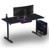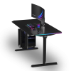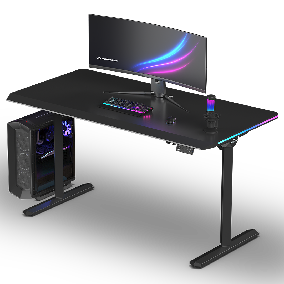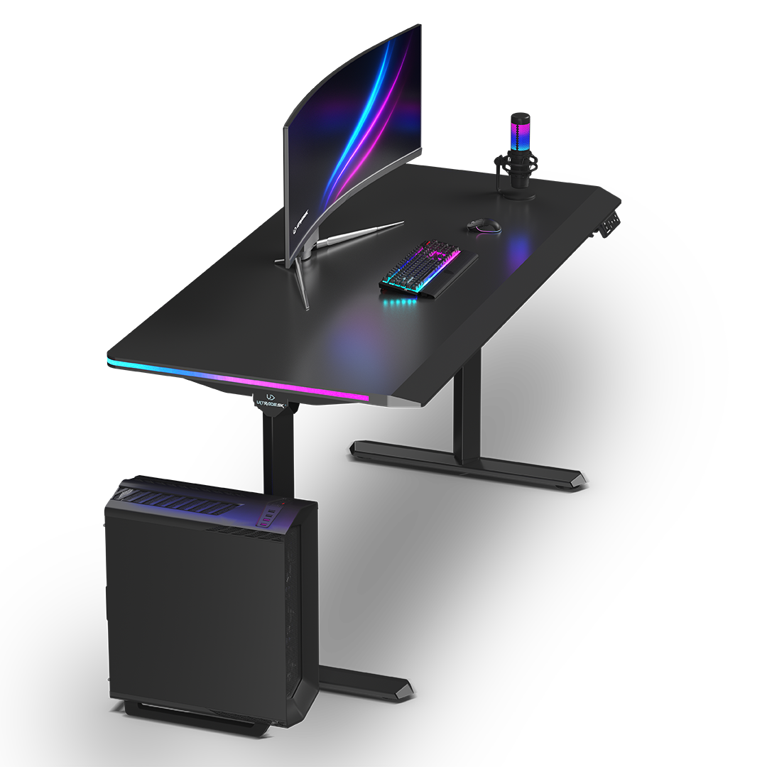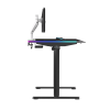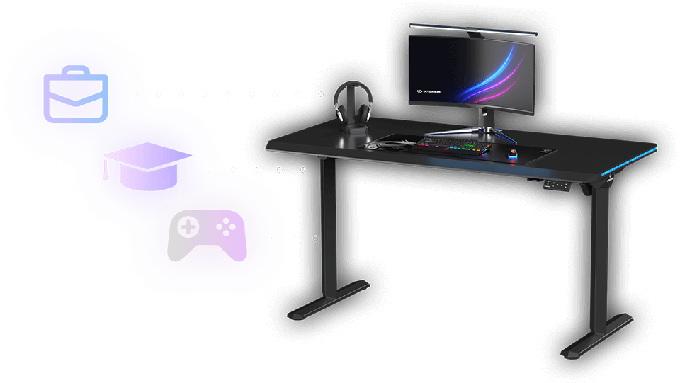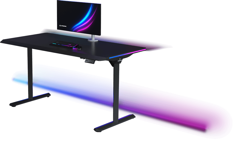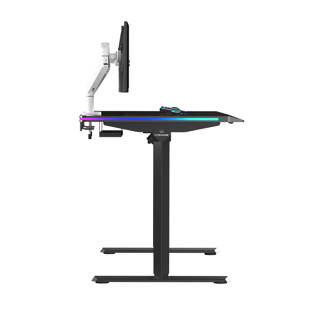 ULTRADESK QUEST is a modern computer desk with electric height adjustment, a thick, one-piece desktop, a reinforced frame, and unique LED RGB PRISMATIC lighting. It also features a user-friendly control panel with internal memory, a shelf for cables and power strips, and numerous features that enhance durability and ergonomics. QUEST guarantees a high level of safety and an appealing design. High-quality materials ensure that it retains its visual and functional qualities for years to come. This exceptional computer desk is perfect for ambitious users who appreciate thoughtful furniture design.