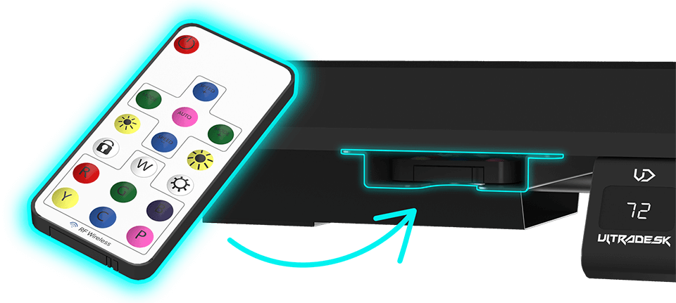 The compact remote control allows you to configure the LED RGB PRISMATIC lighting in no time. You can adjust brightness and color, activate special modes, regulate the speed of the lighting effects, or turn the lighting off completely. The remote control can be stored in a small compartment under the desktop.
